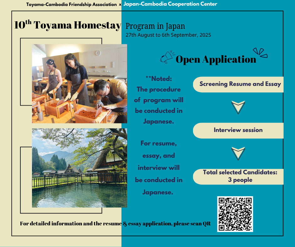 The Cambodia-Japan Cooperation Center is colloborating with Toyama-Cambodia Friendship Association to host the homestay program in Toyama Prefecture, Japan from 27th August to 6th September, 2025.