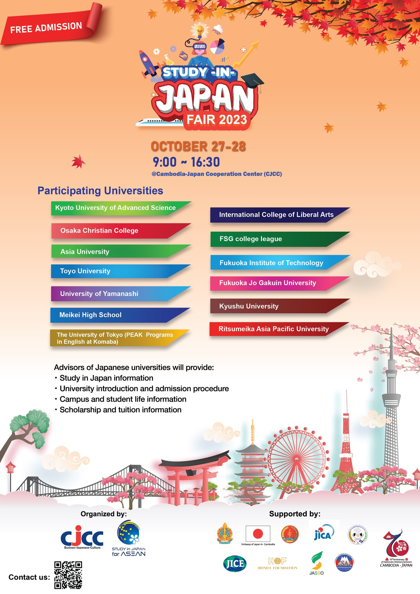 The Cambodia-Japan Cooperation Center (CJCC) in cooperate with the Study in Japan Global Network Project in ASEAN/Okayama University will conduct the Study-in-Japan Fair 2023, which aims to share the information about studying in Japan to Cambodian students who wish to higher their education there.