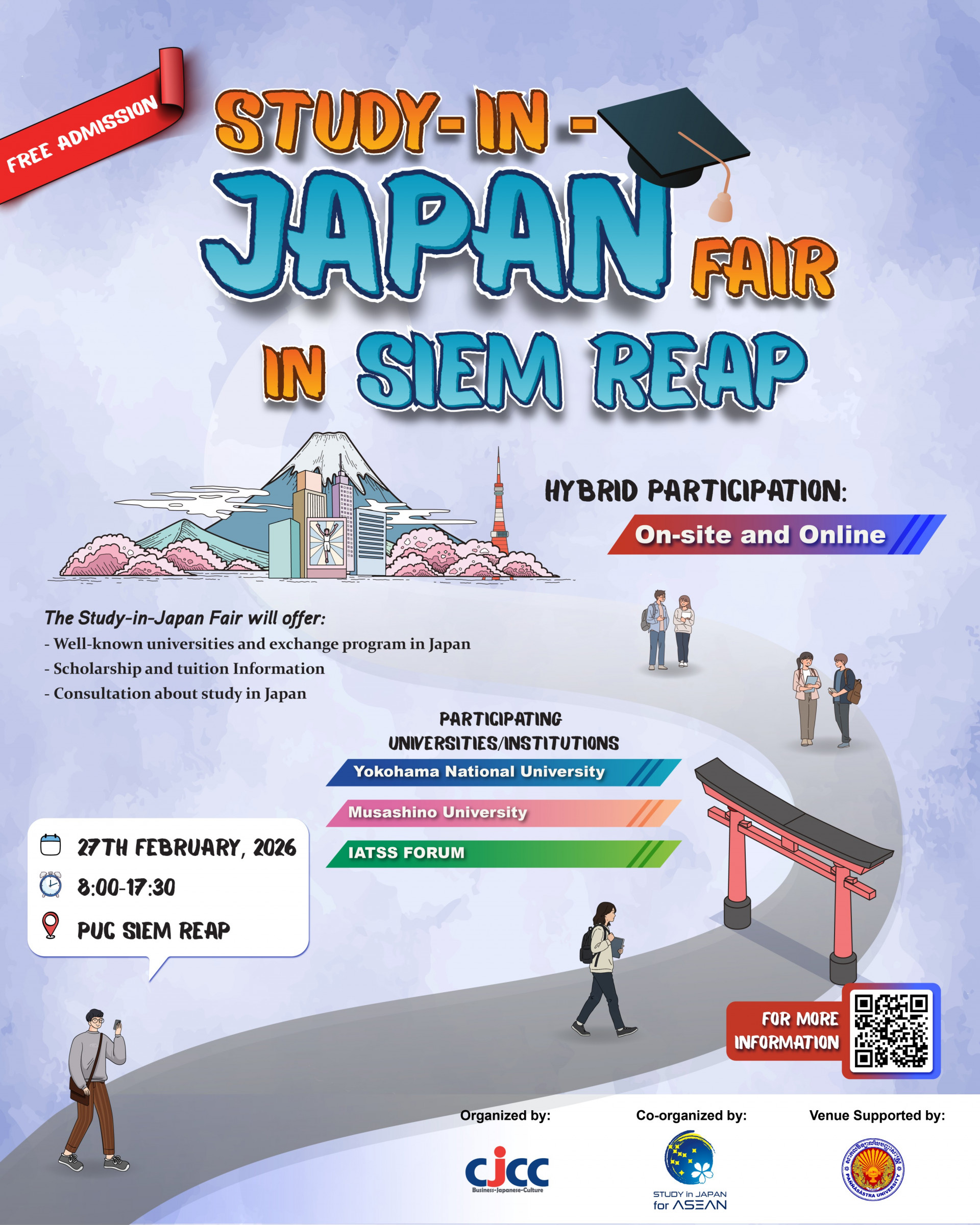 This is a great opportunity for everyone who lives in Siem Reap and wish to know more about studying in Japan. Come to join our event for the free consultation and seminar session from well-known universities/institutions from Japan.